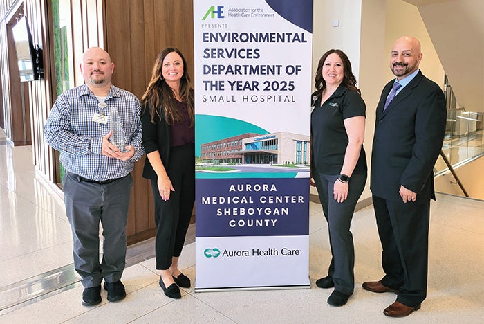 Proudly surrounding a display commemorating their EVS Department of the Year Award are (from left) Advocate Health leadership team members Michael Clark, manager of EVS and linen distribution for Aurora Medical Center Sheboygan County; Amy Petrauski, director of EVS and linen distribution for north and central Wisconsin; Jessi Moffatt, supervisor of EVS for Aurora Medical Center Sheboygan County; and Jose Feliciano, system vice president of EVS, linen distribution and patient transport.