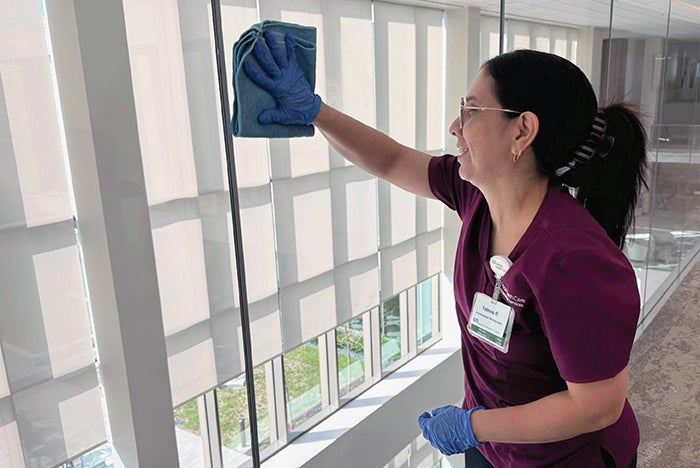 Yalexis Rondon, EVS assistant, cleaning the floor-to-ceiling glass that overlooks the cafeteria seating and healing garden.