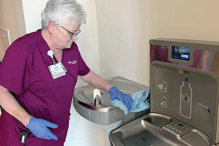 Kim Mertes, EVS lead (now retired), disinfecting the water fountains throughout the facility.