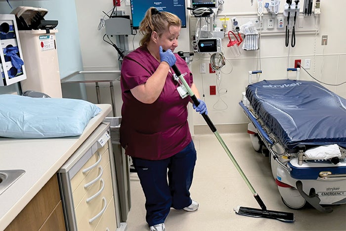 Kim Beltran, EVS assistant, mopping an emergency department exam room and safely preparing it for the next patient.