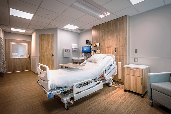 Modernized patient rooms provide clearly defined staff and family zones (nearest the windows) as well as a relocated patient bath that acts as a buffer from the corridor.