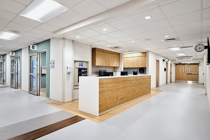 - Emergency department (ED) — A new ambulance entry separates the public entrance from the ambulance entry, distinct patient paths increase patient efficiency, and the path of trauma patients through the waiting room was removed.
