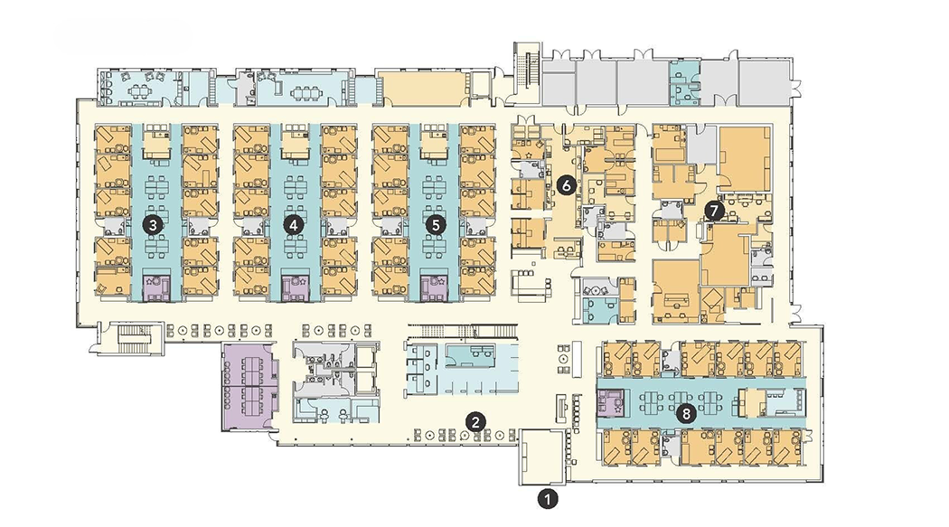 The clinic “pod” (see figure 2 above) is defined as a separate, unique unit of space within a plan that contains a set number of exam rooms that are served by their own care team and adjacent ancillary spaces.