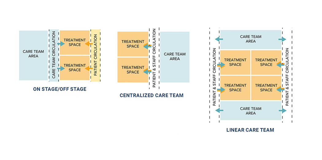 After re-examining the clinics, we noticed that the real relationship driving the size and shape of each of these pods was more about the location of the care team in relation to the exam rooms than it was about circulation. Once this concept was in place, it was simple to identify pod typologies by care team strategy. Onstage/offstage care team typology occurs when the care team is completely separate from patient circulation. Central care teams are located directly adjacent to the shared corridor for maximum visibility of patient traffic and rooms. And linear care teams are located within the treatment space lineup, providing visibility to patient spaces and some privacy to the care team area (see figure 4 below).