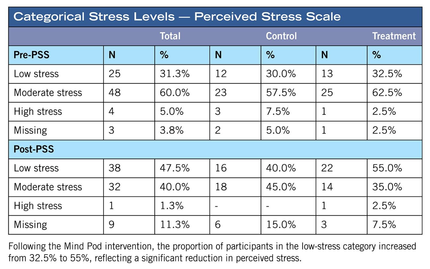 - Statistically significant reductions in perceived stress scores in the treatment group (p<0.001).