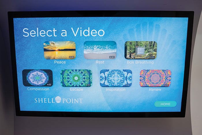 Shell Point’s information technology team worked with Red Dot Digital Media of Carlsbad, Calif., to customize the “in-pod” experience. Upon entering, users are asked to rate their current stress level and then choose from a series of videos ranging from deep breathing exercises and introspection techniques to faith-based content and calming imagery. Before leaving, they rate their stress again, providing immediate feedback on impact.