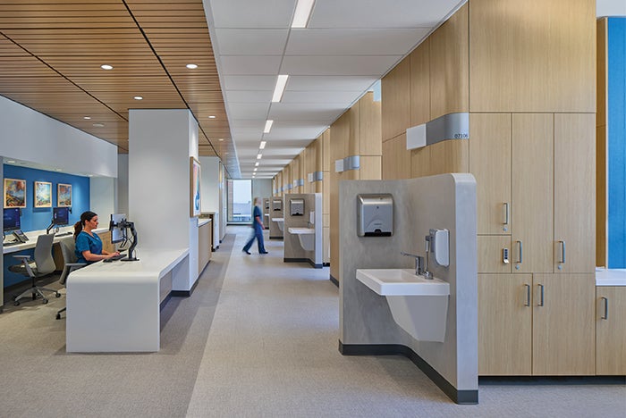 The design team prioritized scenic northern views of the San Gabriel Mountains to further highlight the relationship between the building and its surroundings, maximizing the benefits of natural light on patient and staff satisfaction and well-being. The infusion bays are arranged around the perimeter of the top floors, offering patients expansive views. On the clinic floors, where exam visits are short and require privacy, staff work rooms also are located around the perimeter spaces, giving staff access to natural daylight.