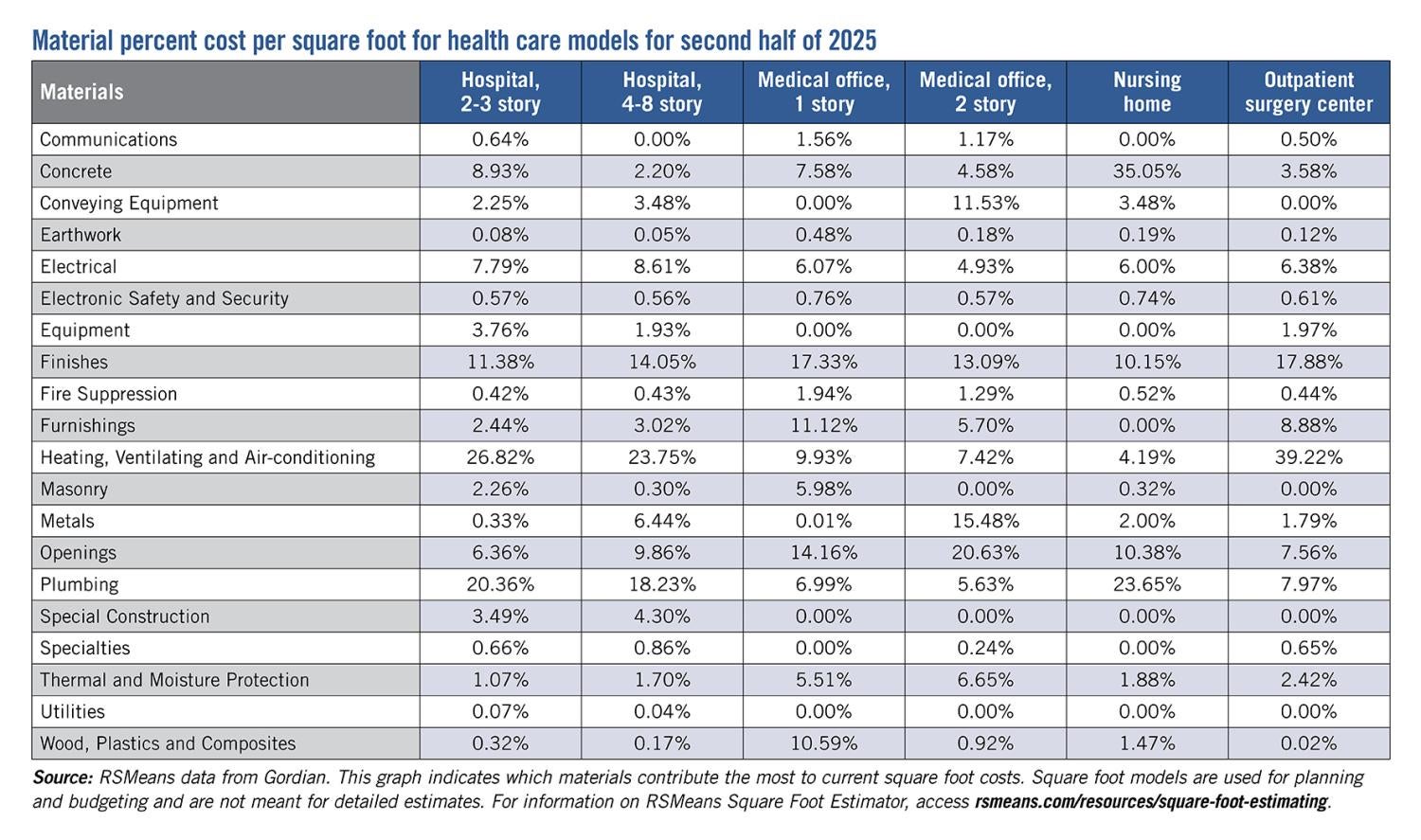While costs were increasing in most of the health care building models, the standard medical office building models were not experiencing the same magnitude of increases. One key driver: plumbing material costs rose 8% to 9% in the last six months of 2025. Plumbing accounts for up to 23.7% of material costs in other models but only 7% in medical offices.