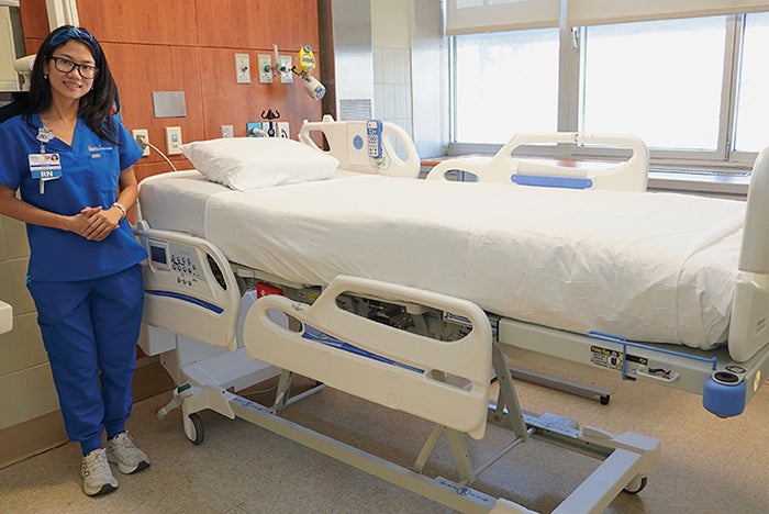 Nurse Mandie Xie shows off one of the new Hillrom Centrella smart beds recently installed in the medical-surgical units at NYC Health + Hospitals/Harlem.